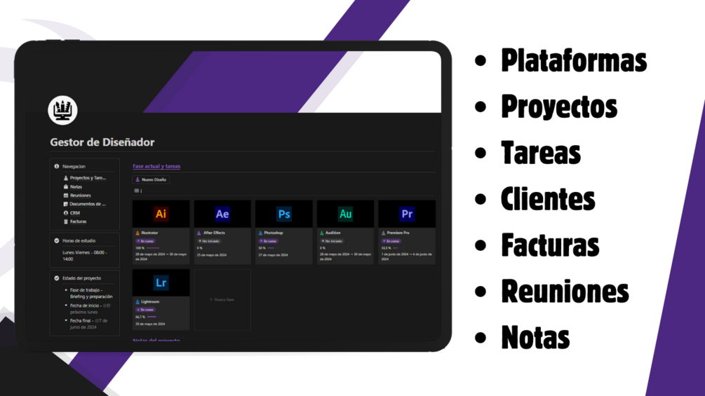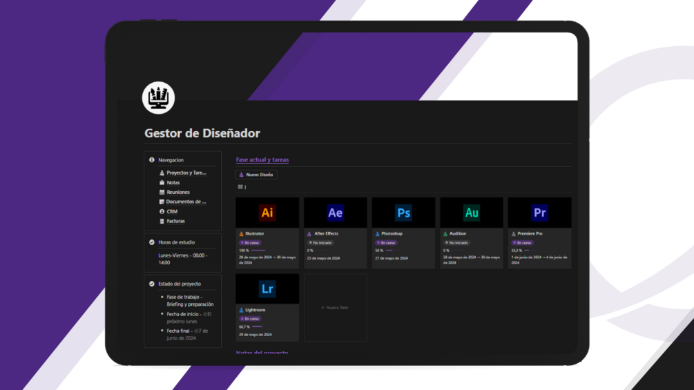 Imagina tener todos tus proyectos de diseño, clientes, tareas y reuniones organizados en un solo lugar, sin el caos de múltiples herramientas y notas sueltas. Con nuestra plantilla, la gestión de tu trabajo será más eficiente y clara, permitiéndote enfocarte en lo que mejor haces: diseñar.